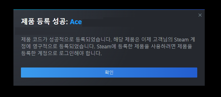 ▲ 정상적인 코드를 등록하면 위와 같이 제품 등록 성공 창이 나타나며, 등록한 스팀 게임이 라이브러리에 추가됩니다.
