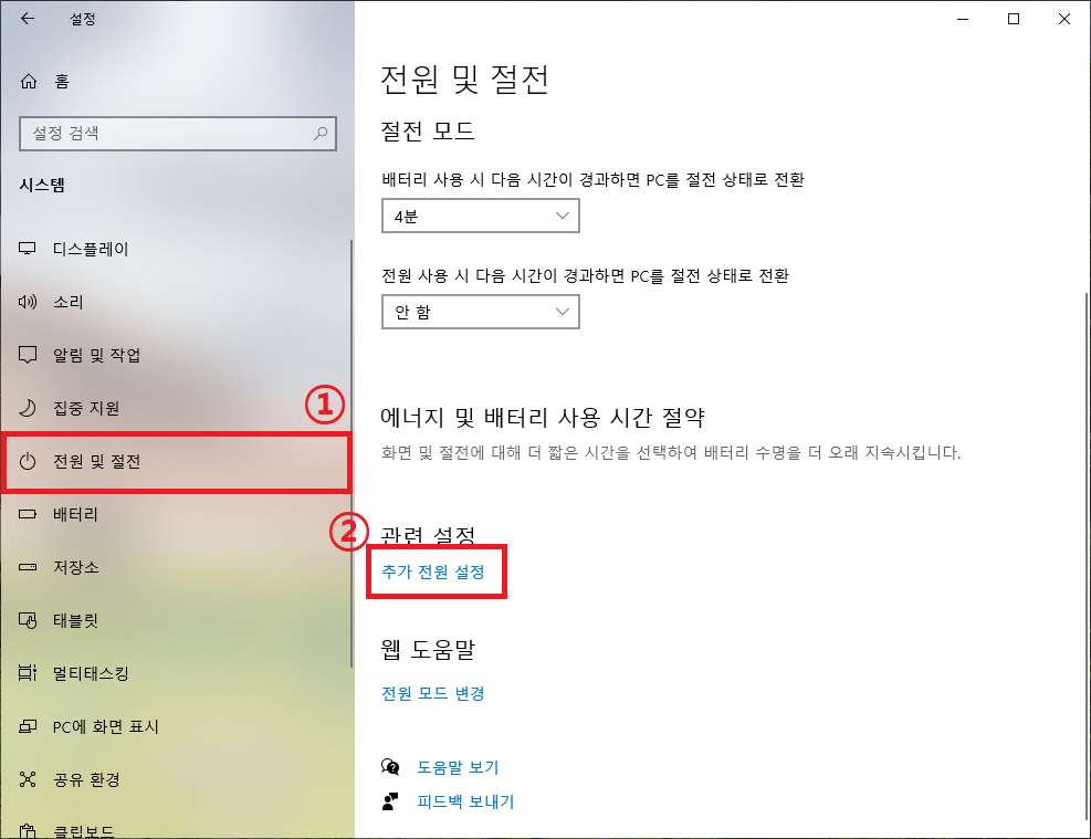 ▲ 시스템 설정창으로 이동한 후 좌측에 있는 메뉴에서 "전원 및 절전"을 클릭하신 후 하단에 있는 관련 설정 부분에 "추가 전원 설정"을 클릭합니다.