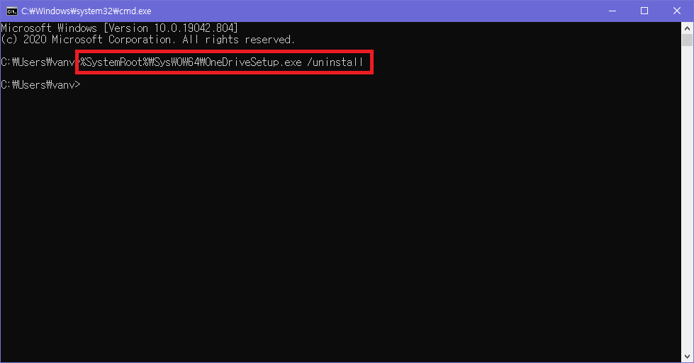 ▲ 명령 프롬프트가 열리면 "%SystemRoot%\SysWOW64\OneDriveSetup.exe /unintall" 명령어 입력 후 "엔터"를 눌러줍니다.