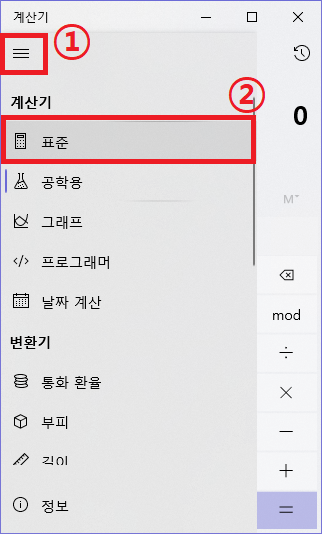 계산기 프로그램 우측 상단에 있는 "3줄 메뉴"를 클릭하신 후 "표준"모드 계산기를 클릭합니다.