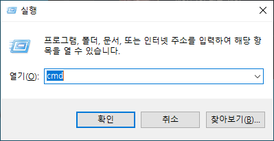 [윈도우키 +R]단축키를 사용하여 실행창을 열어주신 후 "CMD"명령어를 입력 후 확인을 클릭합니다.
