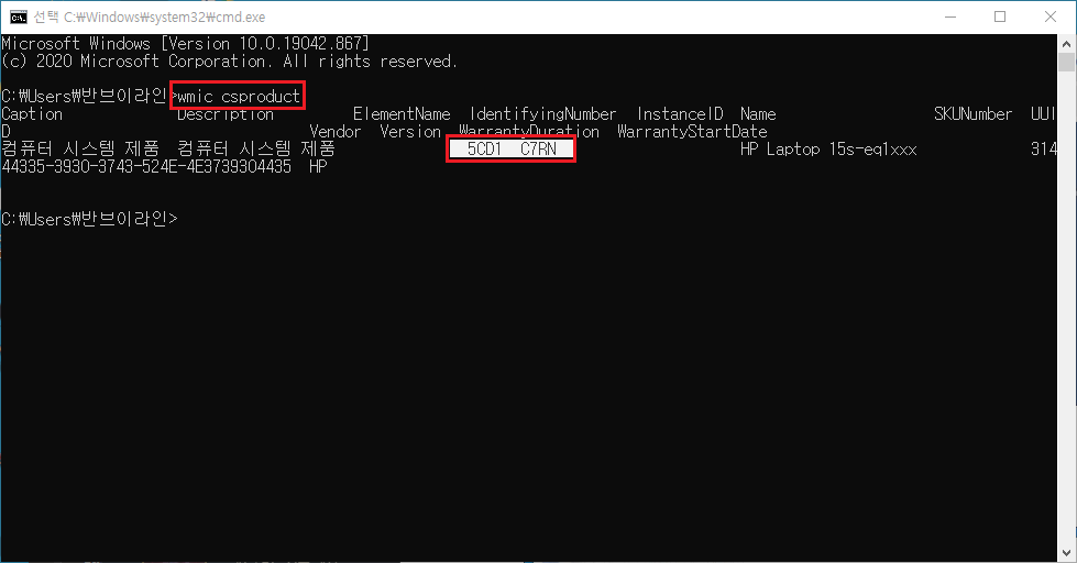 ▲ 명령 프롬프트창이 열리면 "wmic csproduct"명령어 입력 후 엔터를 눌러줍니다.