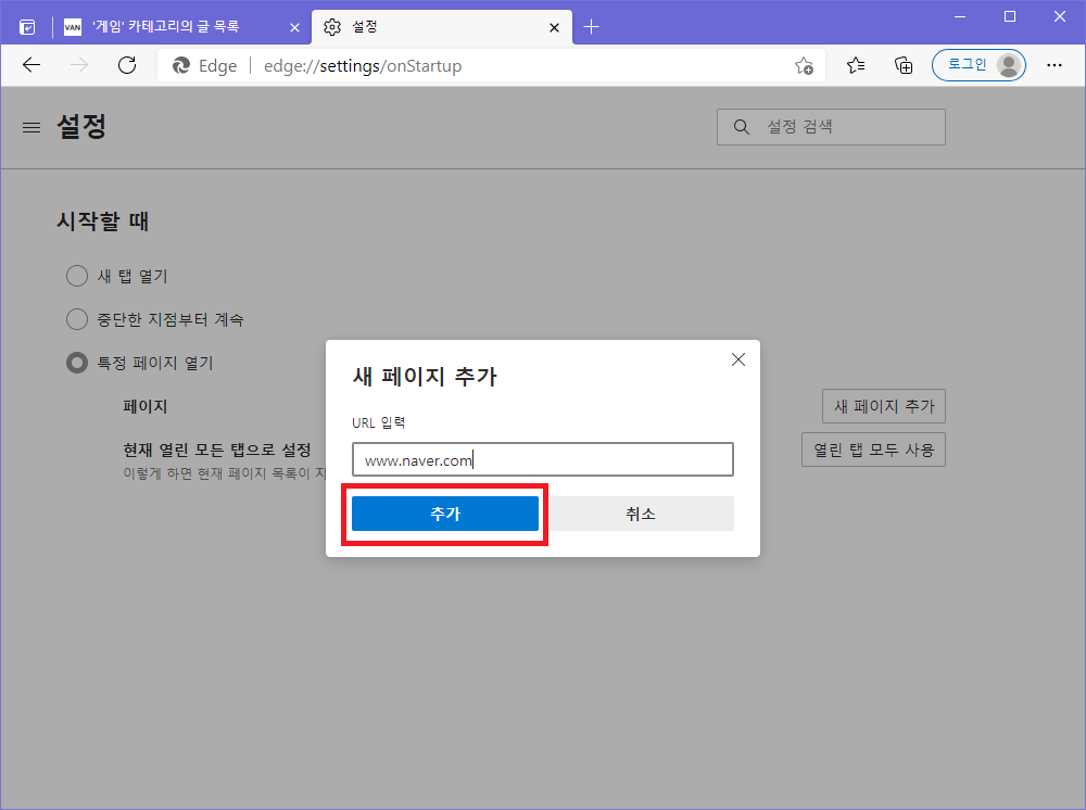 ▲ 새 페이지 추가창이 열리면 마이크로소프트 엣지 인터넷 시작페이지로 지정할 URL을 입력 후 "추가"를 클릭합니다.
