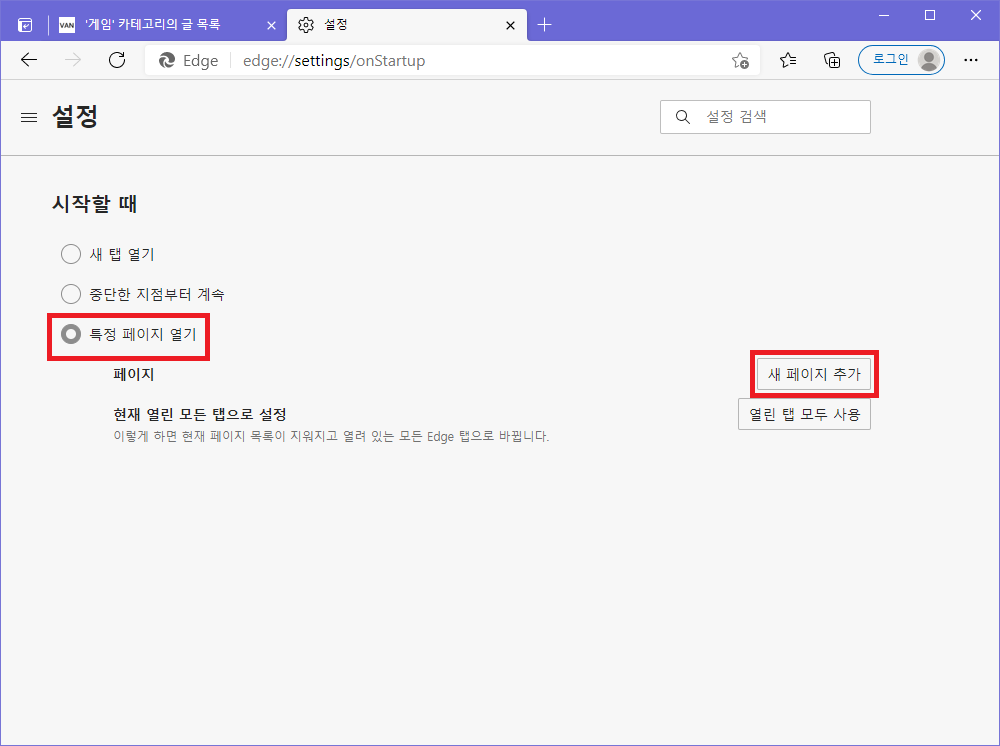 ▲ 시작할 때 설정창으로 이동 후 "특정 페이지 열기"를 클릭 한 후 "새 페이지 추가"를 클릭합니다.