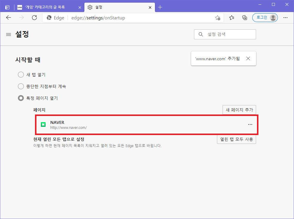 ▲ 시작 페이지 추가를 완료하면 위와 같이 페이지 부분에 자신이 추가한 시작페이지가 추가 됩니다.