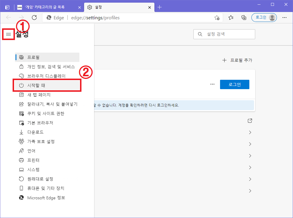 ▲ 마이크로소프트 엣지 설정창이 열리면 좌측 상단에 있는 설정 메뉴를 클릭 후 "시작할 때"를 클릭합니다.