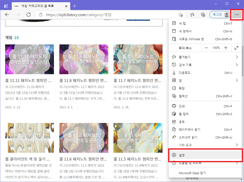▲ 우선 마이크로소프트 엣지 실행 후 우측 상단에 있는 "..."아이콘을 클릭 후 "설정"을 클릭합니다.