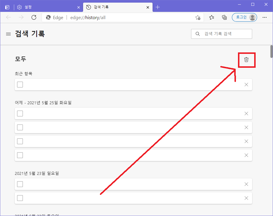 ▲ 검색 기록 설정창이 나타나면, 우측 상단에 있는 "휴지통 아이콘"을 클릭합니다.