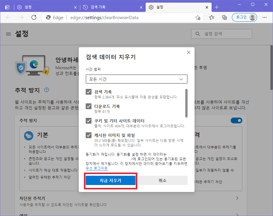 검색 기록만 지우기 위해서는 검색 기록에만 체크를 해주시고 다운로드 기록 및 쿠키,캐시 파일까지 모두 삭제하기 위해서는 모두 체크를 하신 후 "지금 지우기"를 클릭하여 마이크로소프트 엣지 검색 기록을 삭제해주시면 됩니다.