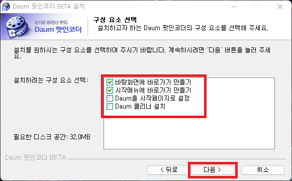 ▲ 구성 요소 선택 부분에서 [Daum을 시작페이지로 설정 / Daum 클리너 설치]의 체크를 해제후 "다음"을 클릭합니다.