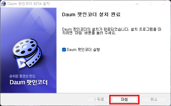 ▲ 다음팟인코더 설치가 완료되면, [Daum 팟인코더 실행]부분에 체크 후 "마침"을 클릭하여 설치프로그램을 종료합니다.