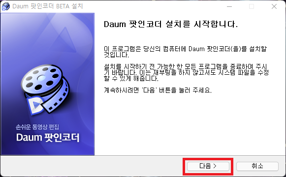 ▲ 다음팟인코더 설치프로그램이 실행되면, "다음"을 클릭합니다.