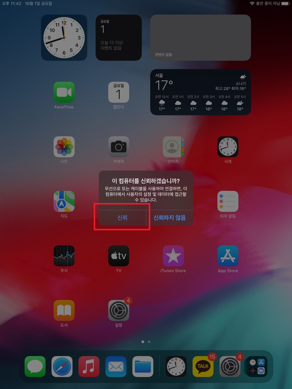 ▲ 그럼 아이패드에서 [이 컴퓨터를 신뢰하시겠습니까?] 메세지가 나타나는데, 아이패드 배터리 수명을 확인하기 위해서 "신뢰"를 눌러줍니다.