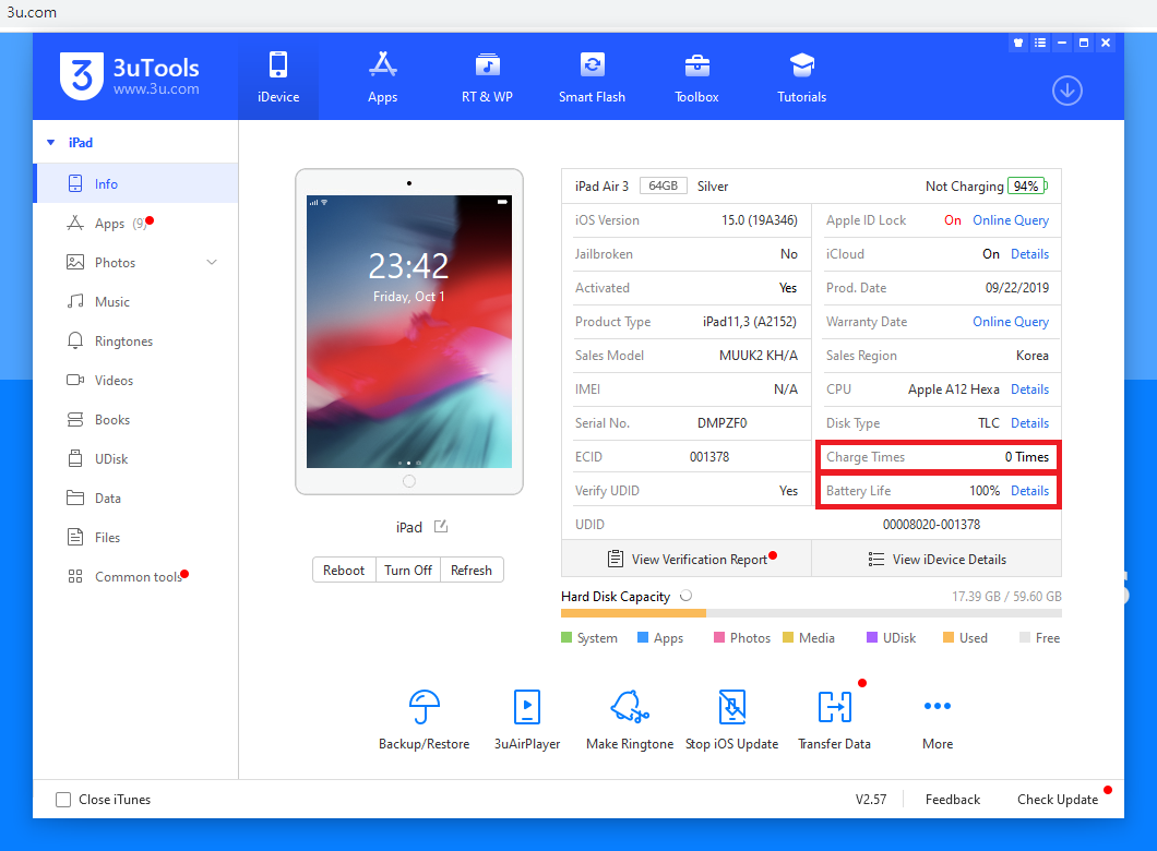 ▲ 그 후 다시 3uTools 프로그램을 확인하면 위와 같이 연결된 아이패드의 정보와 함께 Charge Times 부분에서 배터리 사이클을 Battery Life 부분에서 아이패드 배터리 성능 수명을 확인하실 수 있습니다.