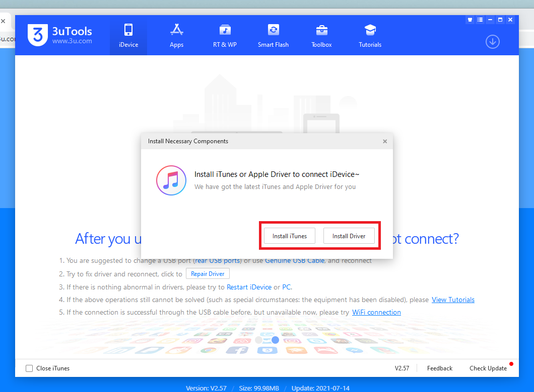 "Install iTunes / Install Driver" 중 하나를 선택하여 클릭합니다.
