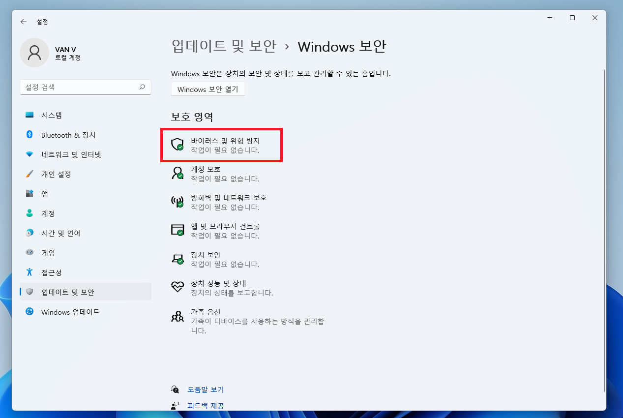 ▲ Windows 보안 설정창으로 이동하셨다면, "바이러스 및 위협 방지"를 클릭합니다.