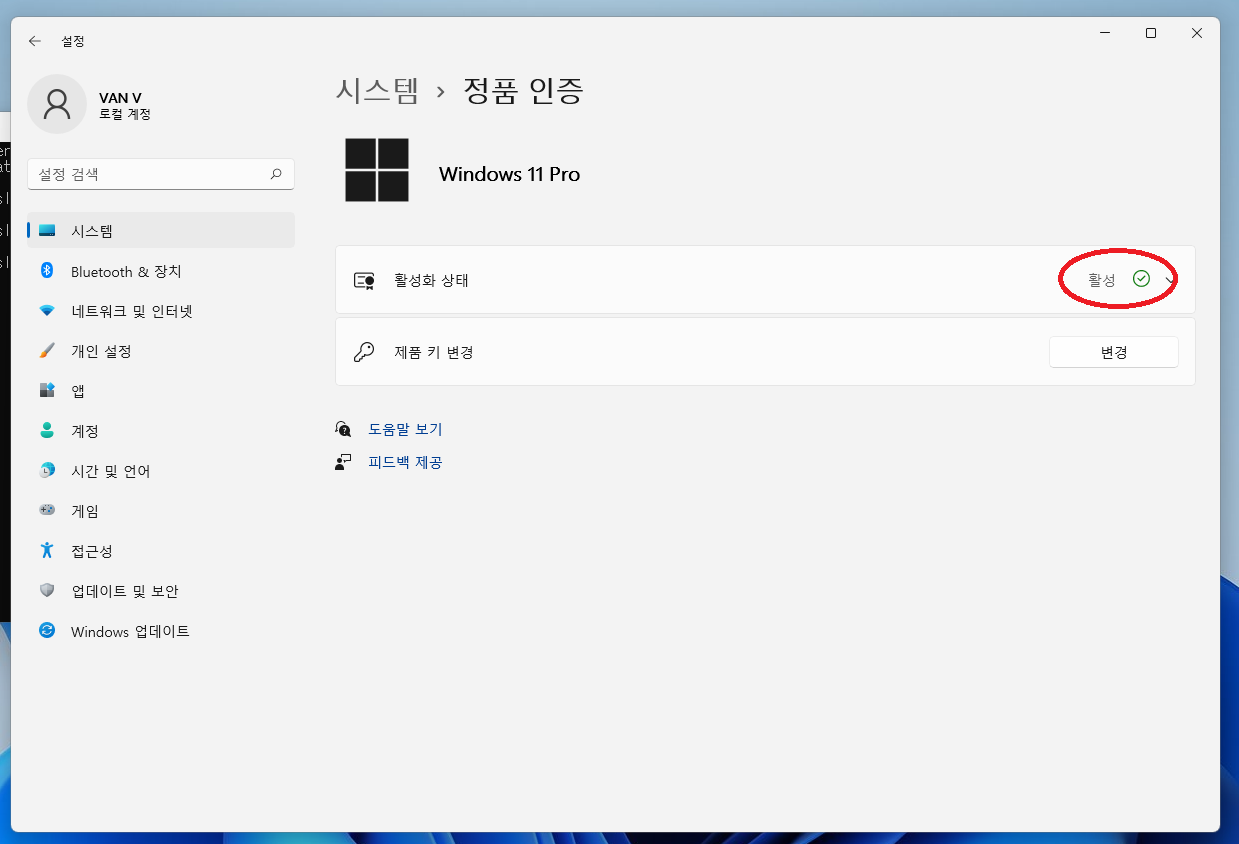 ▲ 정품인증완료 후 다시 윈도우 설정 시스템 - 정품 인증 부분의 활성화 상태가 활성 상태로 변경된 것을 확인하실 수 있습니다.
