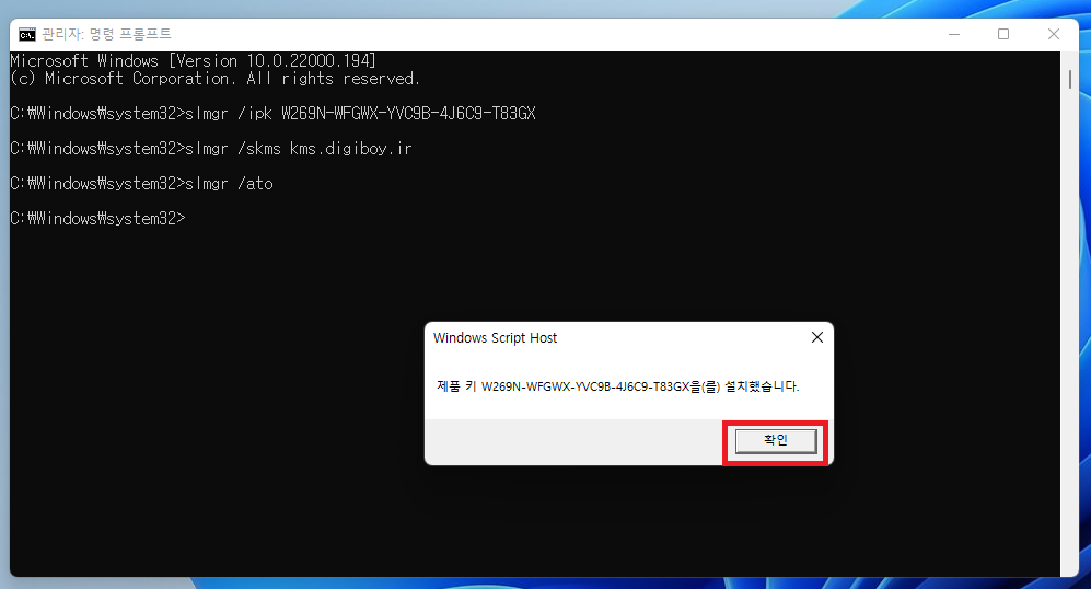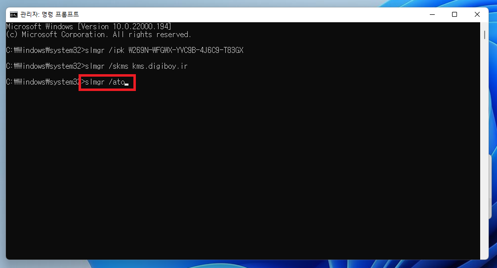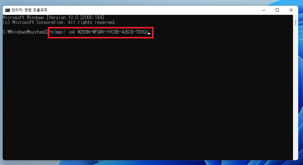 ▲ 이제 명령 프롬프트를 이용하여 윈도우11 정품인증을 하면됩니다.