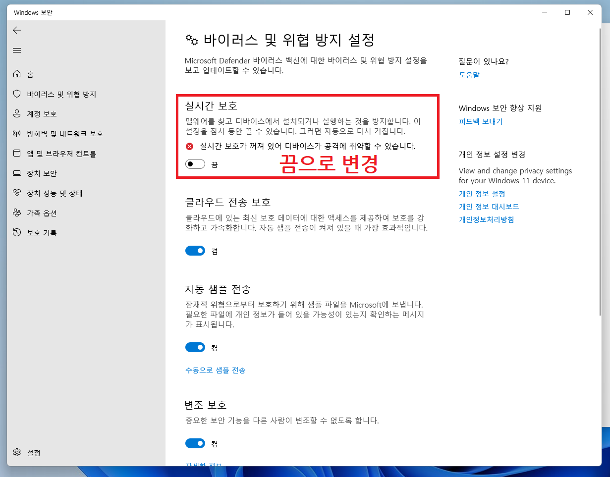 ▲ 바이러스 및 위협 방지 설정 부분에 있는 실시간 보호를 "끔" 상태로 변경합니다.