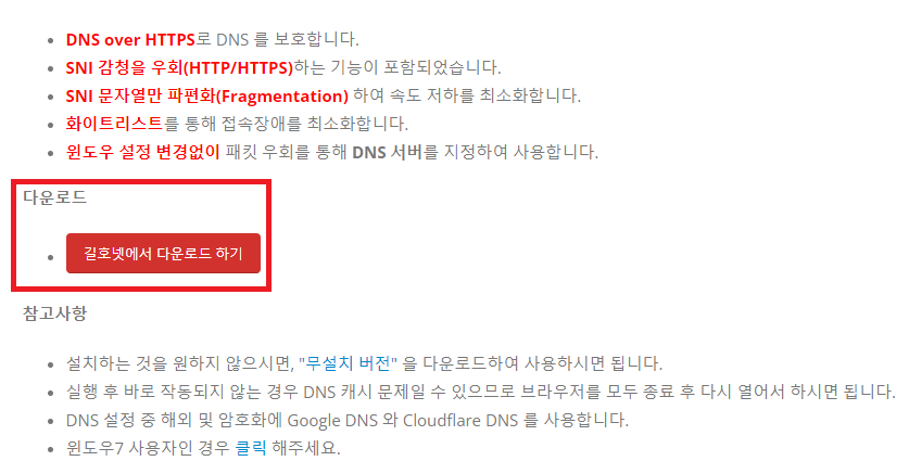 ▲ 우선 하단에 있는 링크를 통하여 시크릿 DNS 다운로드 페이지로 이동하여 다운로드하거나 첨부파일을 통하여 시크릿 DNS 무설치판을 다운로드 및 실행합니다.