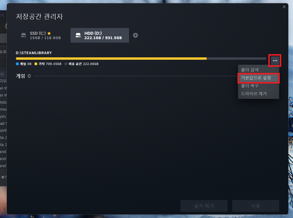 스팀에서 게임을 다운로드 받을때 기본적으로 C드라이브로 지정되어있기 때문에 C드라이브의 용량이 부족하신분들은 다른 드라이브에 게임을 다운로드 받고싶으신분들이 있으실겁니다.