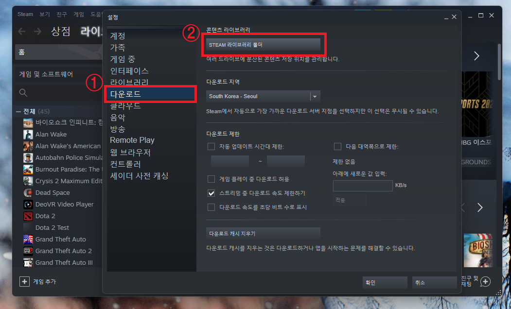 ▲ 설정창이 나타나면, "다운로드" 탭을 클릭 후 "STEAM 라이브러리 폴더"를 클릭합니다.