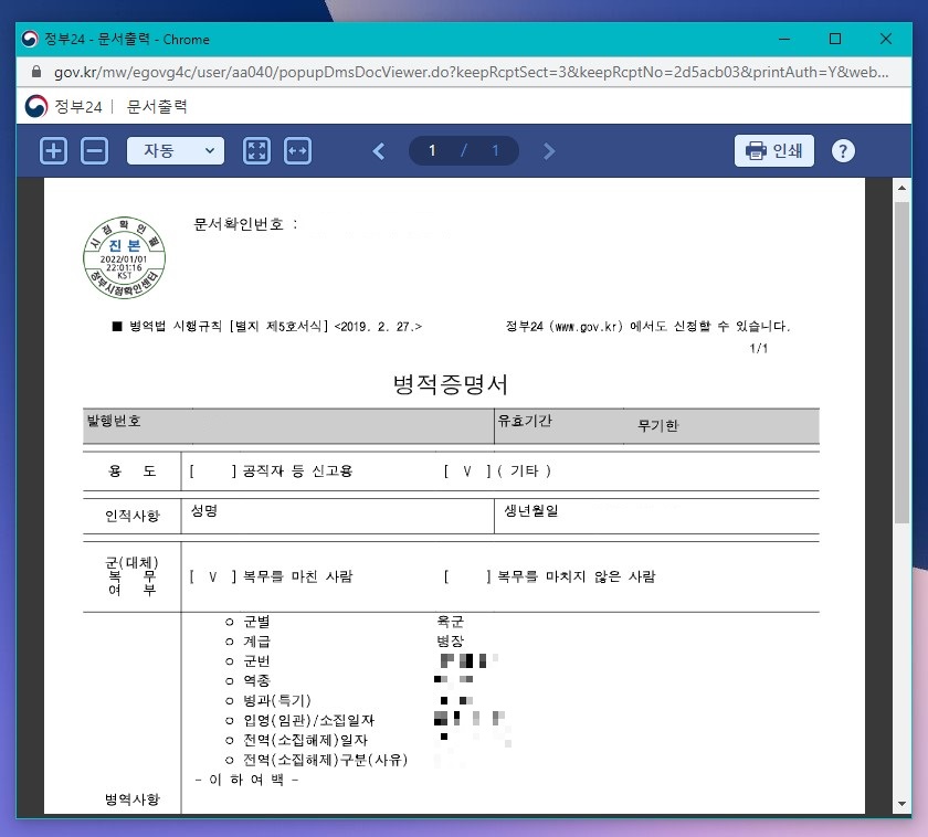 ▲ 병적증명서발급이 완료되면 위와 같이 나타납니다.