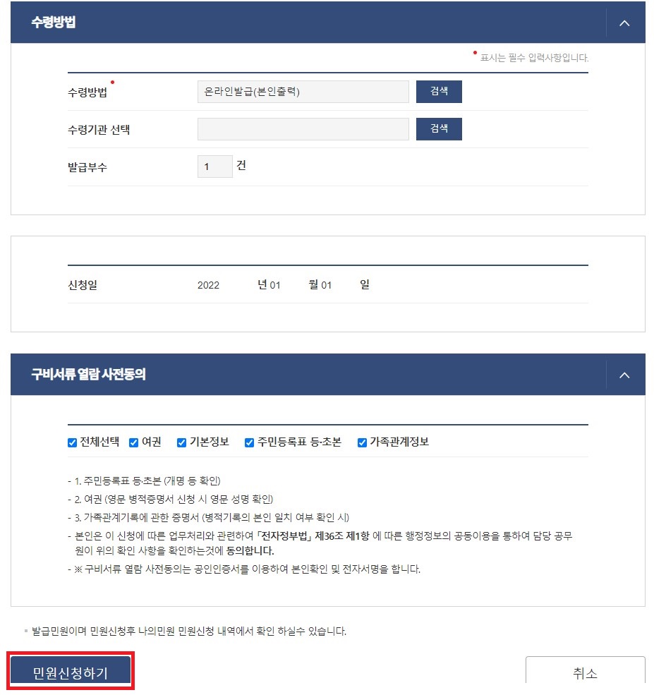 ▲ 다음으로 이동 후 수령 방법은 기본인 [온라인발급(본인출력)]으로 선탠 후 "민원신청하기"를 클릭합니다.