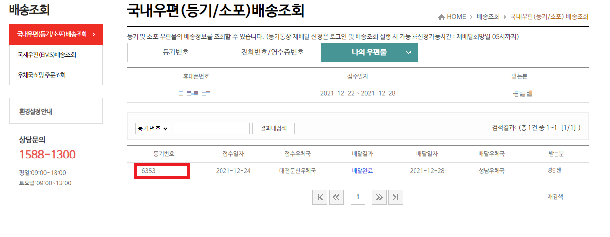 ▲ 그럼 위와 같이 설정한 날짜에 정보에 맞는 우체국택배 배송조회 목록이 나타납니다.