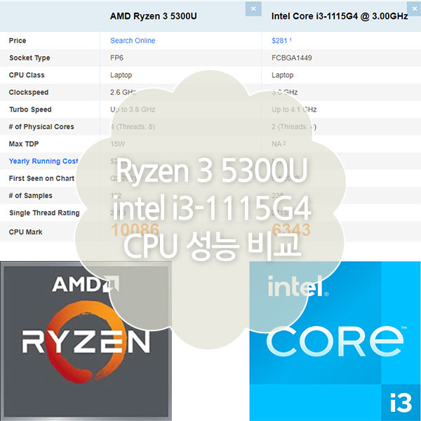 AMD Ryzen 3 5300U VS intel i3-1115G4 CPU 성능 비교