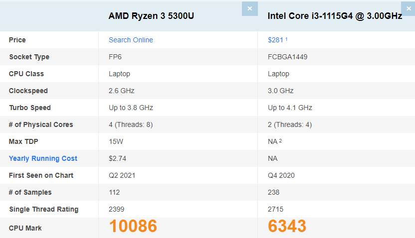 아무래도 코어수가 Ryzen 3 5300U의 경우 4코어 8스레드, intel i3-1115G4의 경우 2코어 4스레드 이기 때문에 코어수 차이가 있는데요.