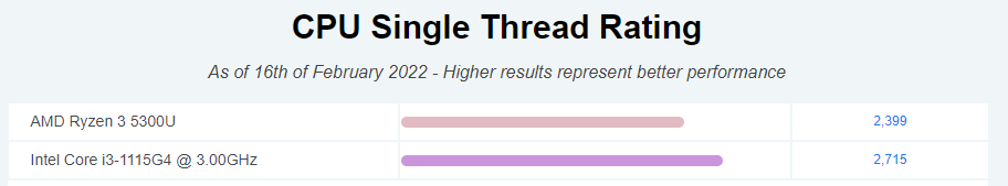 싱글코어 성능은 intel i3-1115G4가 Ryzen 3 5300U CPU 보다 약 10% 정도 더 좋습니다.