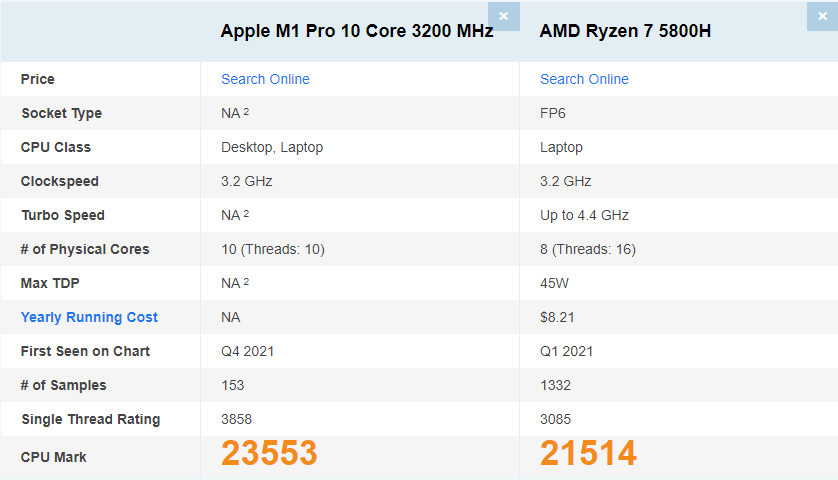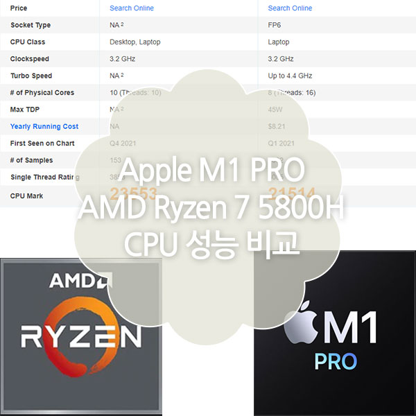 Apple M1 Pro VS AMD Ryzen 7 5800H CPU 성능비교