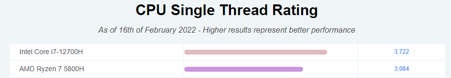 싱글코어 성능 또한 intel i7-12700H CPU가 약 20% 정도 더 좋습니다.
