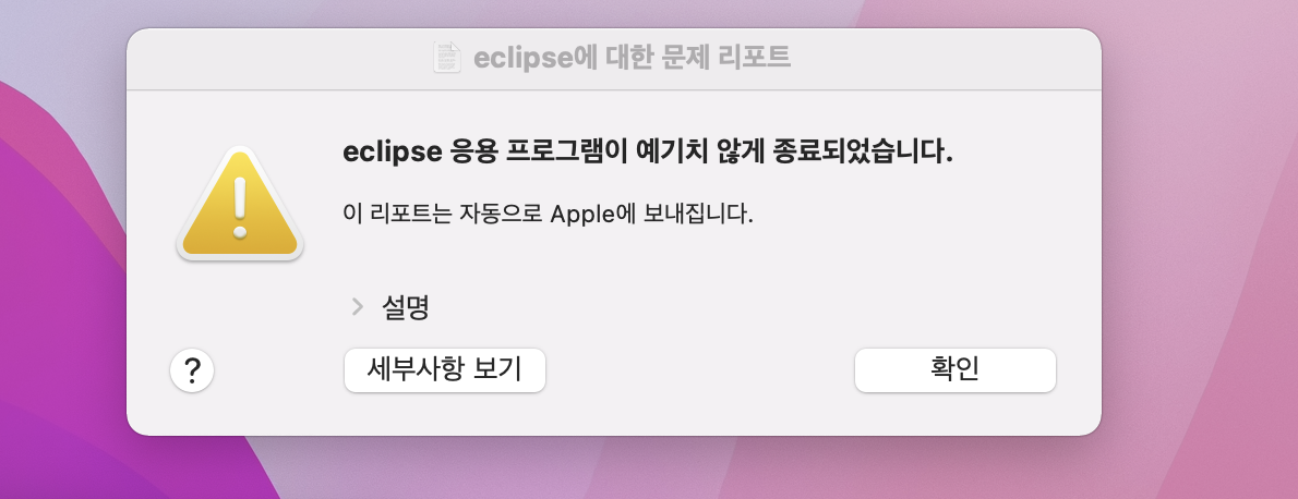 Mac에서 이클립스를 사용하다보면 가끔 응용 프로그램이 예기치 않게 종료되었습니다. 메세지와 함께 프로그램이 실행되지 않는 경우가 있습니다.