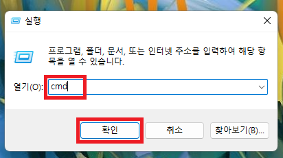 ▲ [윈도우키 + R] 단축키를 사용하여 실행창을 열어주신 후 [cmd] 명령어 입력 후 [확인]을 클릭합니다.