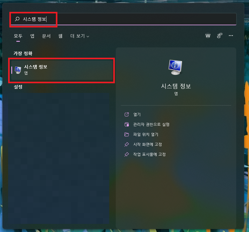 ▲ [윈도우키 + Q] 단축키를 사용하여 윈도우 검색창을 열어주신 후 [시스템 정보]를 검색 후 클릭합니다.