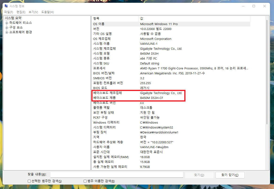 ▲ 시스템 정보창에서 [베이스보드 제조업체, 베이스보드 제품] 부분에서 컴퓨터의 메인보드 모델을 확인하실 수 있습니다.