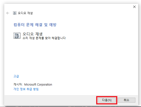 ▲ 오디오 재생 해결창이 나타나면 [다음]을 클릭합니다.