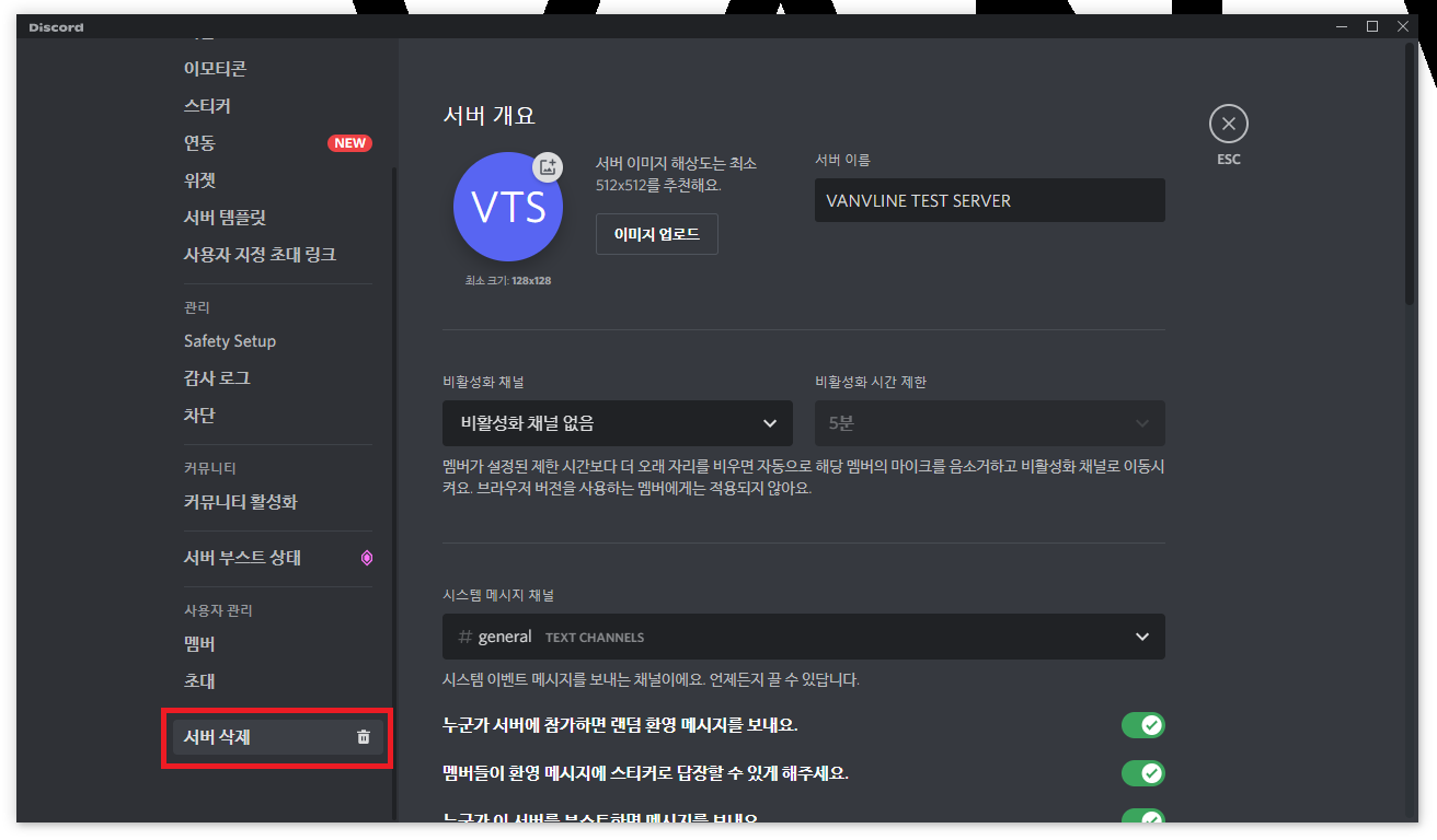 ▲ 서버 설정 페이지로 이동 후 좌측 메뉴 가장 하단에 있는 [서버 삭제]를 클릭합니다.
