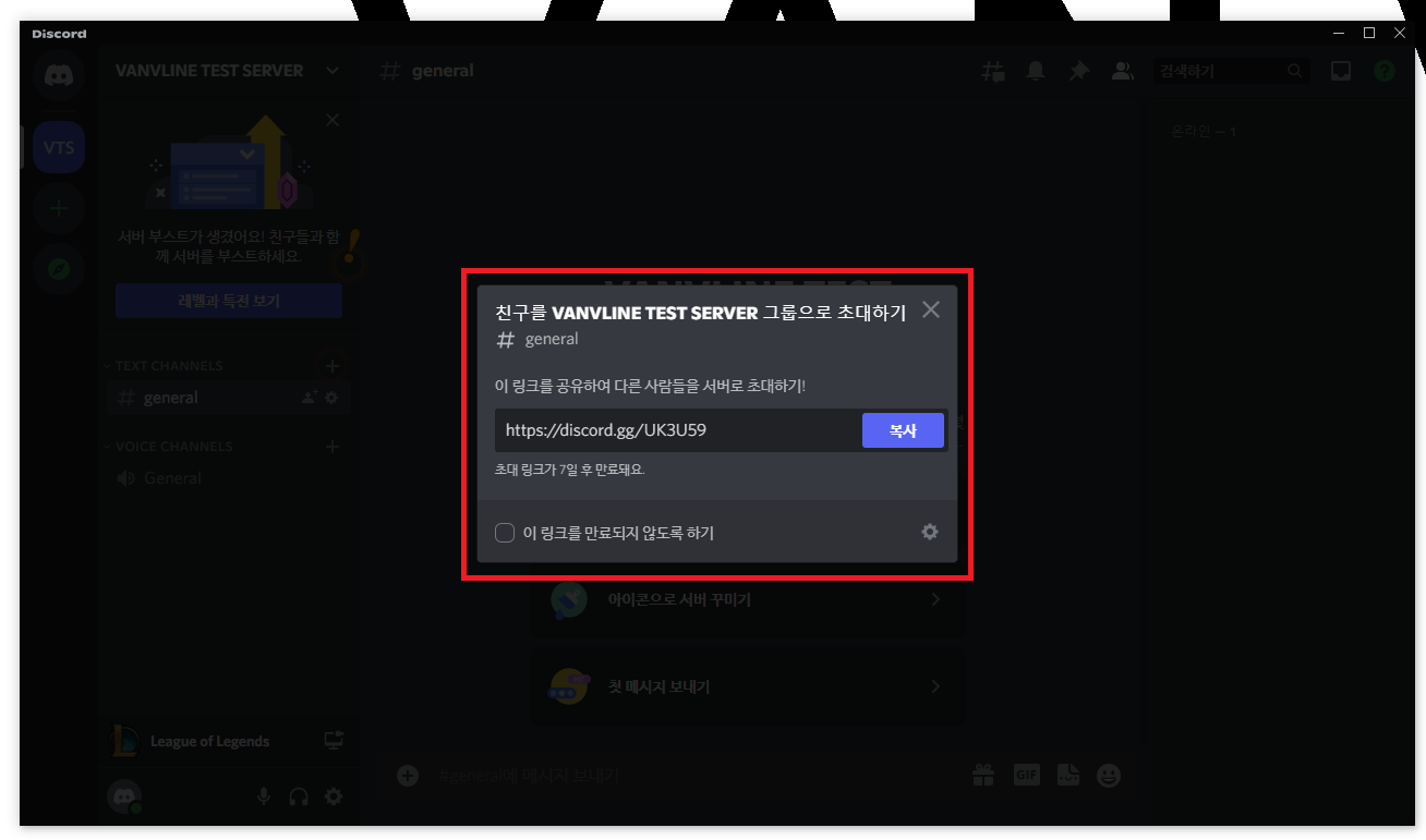 ▲ 그럼 위와 같이 생성한 서버 초대 링크를 확인하실 수 있습니다.
