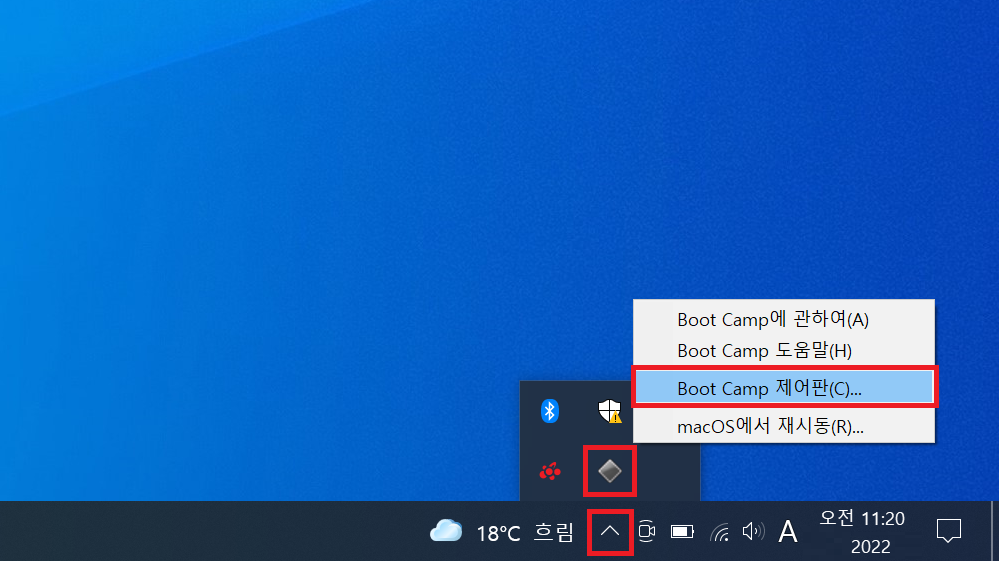 ▲ 우선 부트캠프를 사용하여 윈도우로 부팅 후 작업 표시줄에 있는 부트캠프 아이콘을 [마우스 우 클릭 - Boot Camp 제어판]을 클릭합니다.