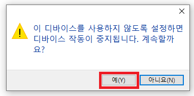 ▲ [이 디바이스를 사용하지 않도록 설정하면 디바이스 작동이 중지됩니다.] 메세지 창이 나타나면, [예]를 클릭합니다.