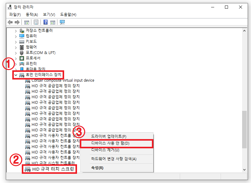▲ 장치 관리자 창이 나타나면, [휴먼 인터페이스 장치 - HID 규격 터치 스크린] 항목을 [마우스 우 클릭 - 디바이스 사용 안 함]을 클릭합니다.