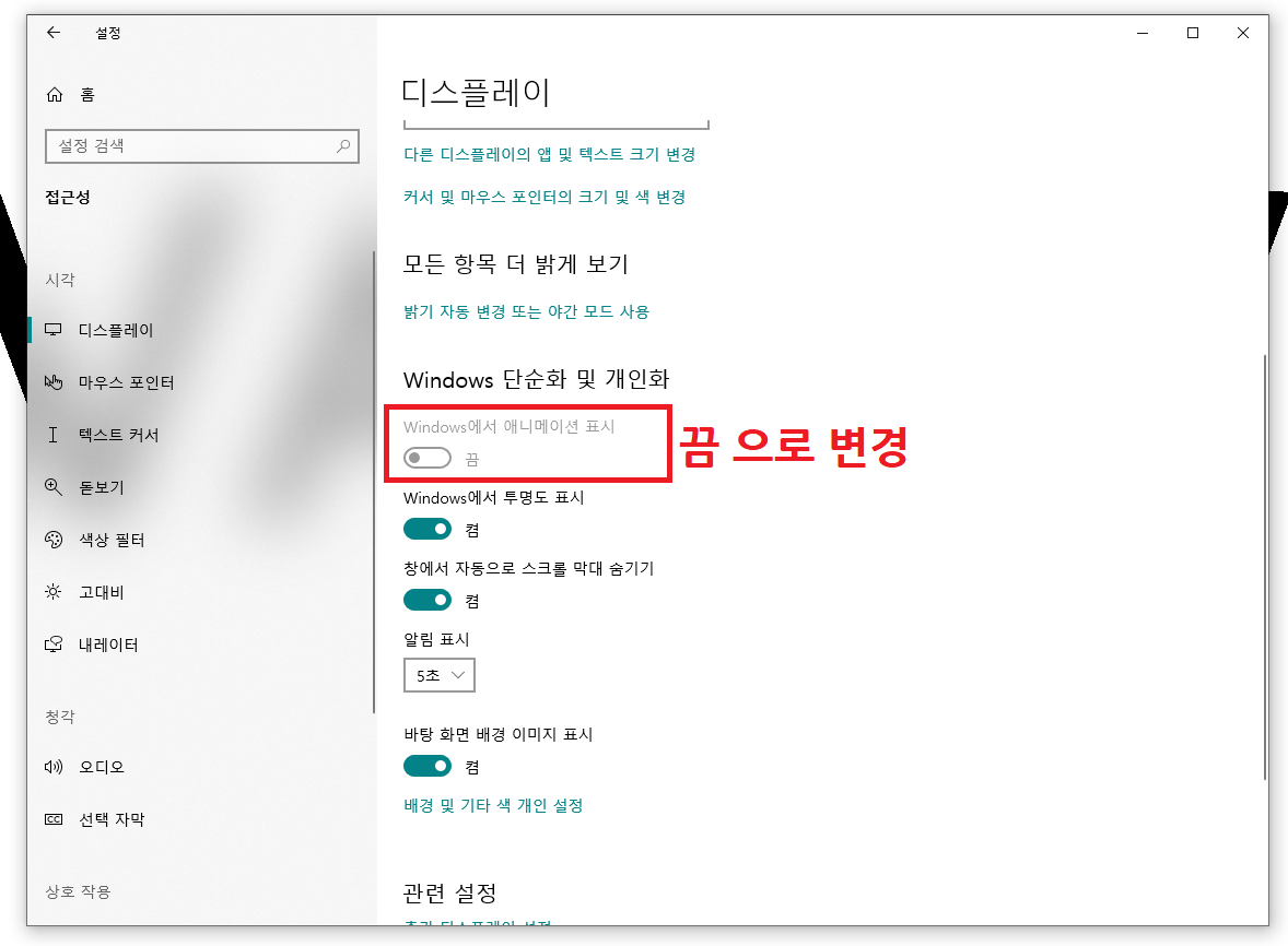 ▲ [Windows에서 애니메이션 표시] 항목을 [끔]으로 변경해줍니다.