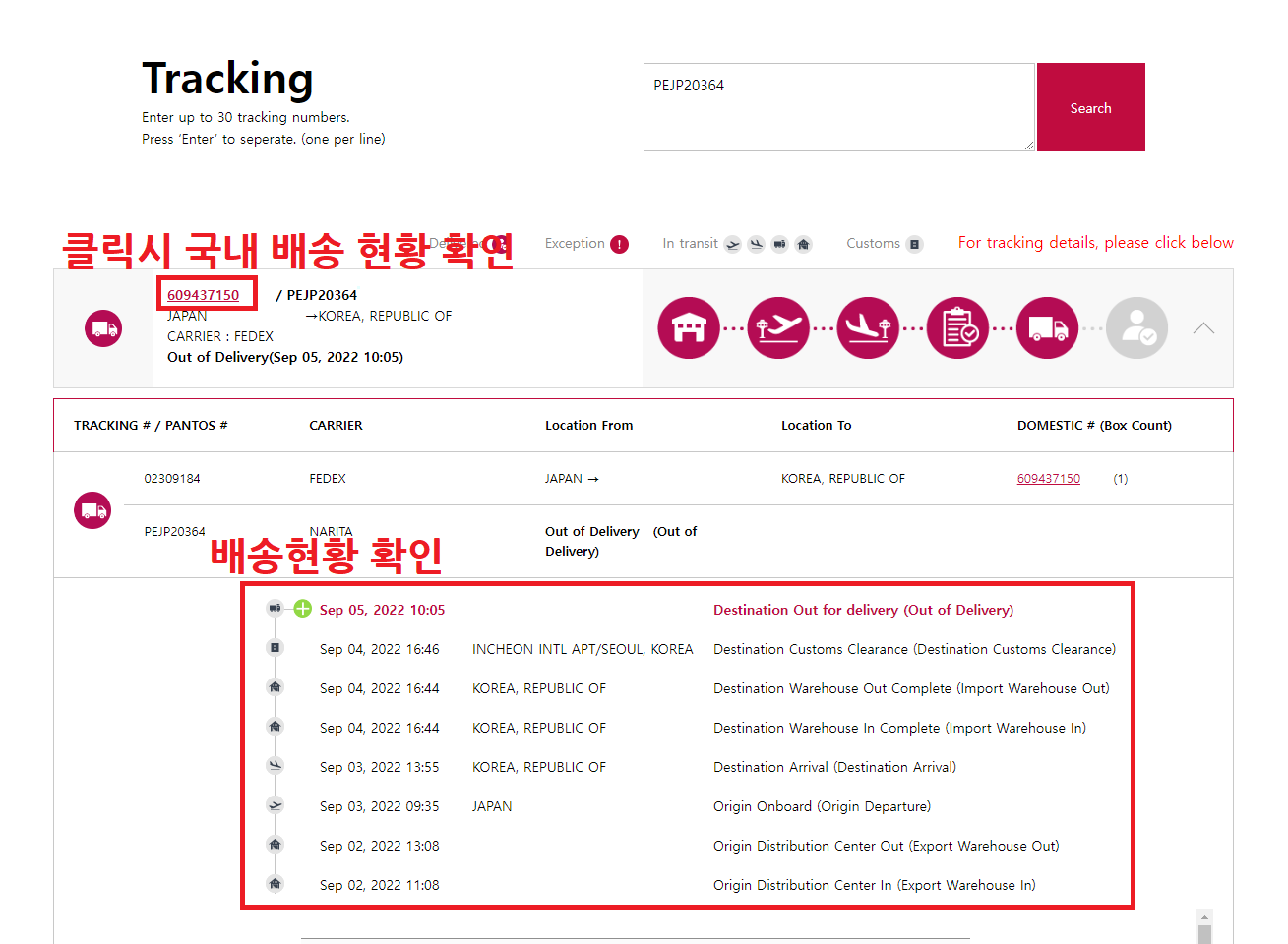 ▲ 우선 하단에 있는 링크를 통하여 범한판토스 배송조회 페이지로 이동 후 검색창 부분에 송장번호를 입력 후 [Search]를 클릭합니다.