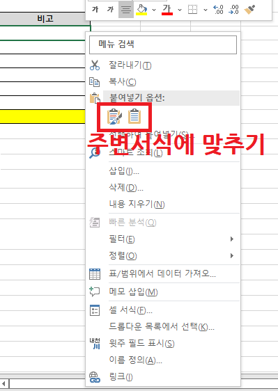 ▲ 이런 경우 엑셀에 내용을 붙여넣을 셀에 [마우스 우 클릭 - 붙여넣기 옵션 (주변서식에 맞추기)]를 클릭합니다.