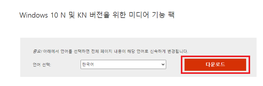 ▲ 위에 있는 링크를 통하여, 자신이 사용하는 PC의 운영체제에 맞는 미디어 기능 팩 다운로드 사이트로 이동하신 후 "다운로드"를 "클릭" 합니다.
