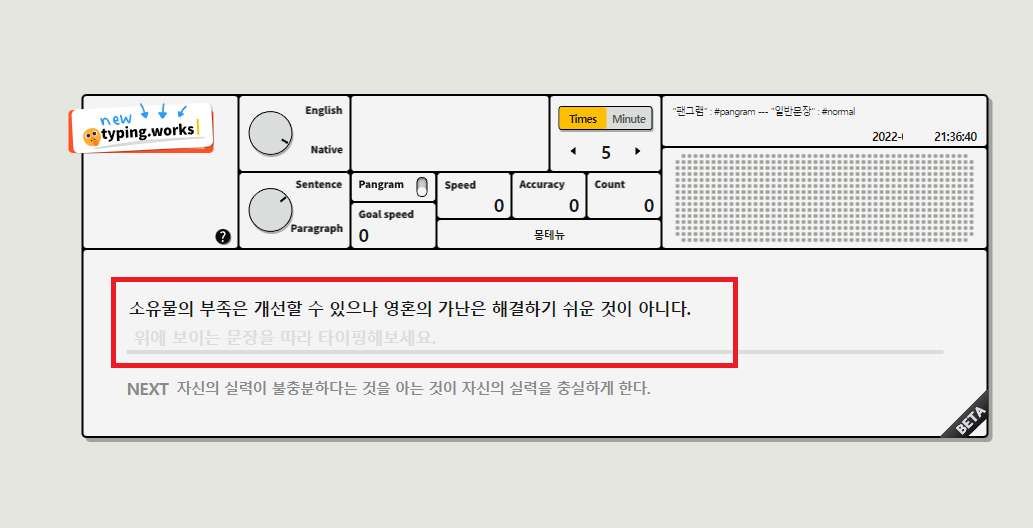 기본적으로 문장은 5개가 나타나며, 해당 문장을 치는 타자 속도를 측정하게 됩니다.