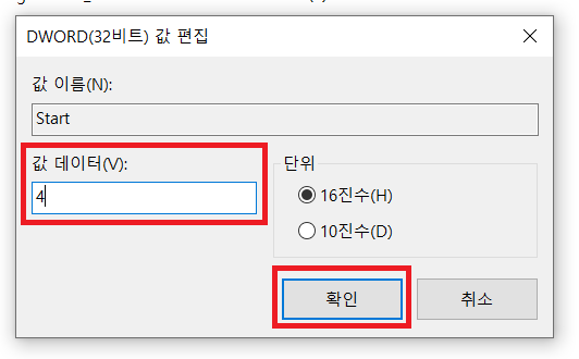 ▲ 값 편집기 창이 나타나면, 값 데이터를 [4]로 변경 후 [확인]을 클릭합니다.